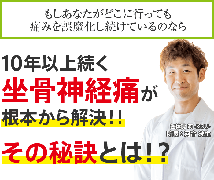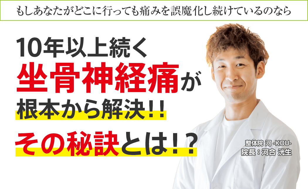 坐骨神経痛に対して、5年以上の研究と経験を持ちあなたの症状に真正面から向き合ってくれる豊橋市で唯一の坐骨神経痛専門整体院 河 -KOU-に来院しこれからその痛みを我慢することなく生活できることを手に入れる道。